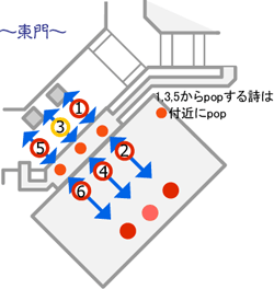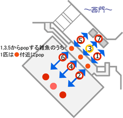 基本的には東門と同じ。異なる点としては、東門NMを処理したことにより露天商の間に7がpopしていること。7の石像は動かないが、3を釣った時点でリンクする。門内のNM付近がリンクしたことと勘違いしないよう。